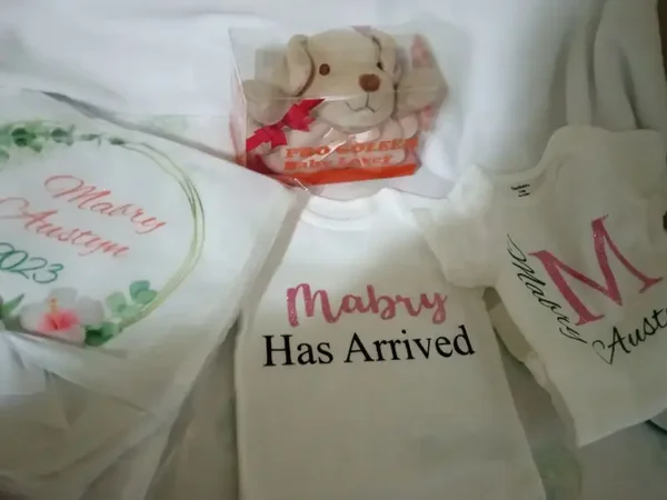 This set includes onesies,a blanket, washcloths, also a baby animal or toy.